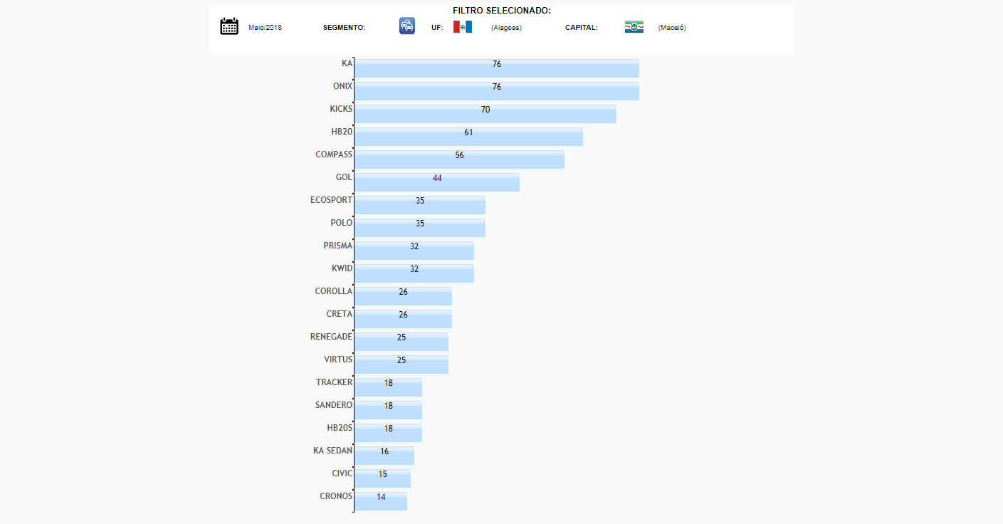Na 6ª posição, mais um SUV, o Ford Ecosport com 35 carros. Na sequência vieram VW Polo, GM Prisma, Renault Kwid e Toyota Corolla fechando o top 10 da capital alagoana.