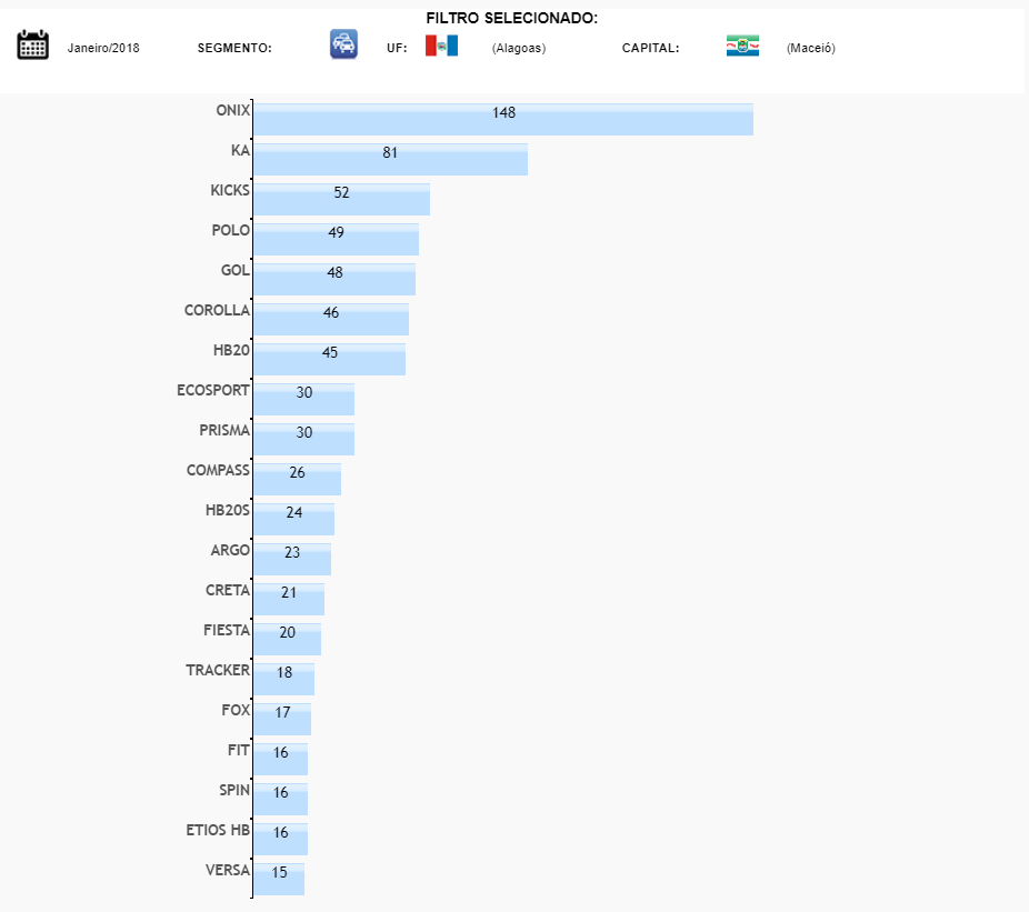 O ranking da capital ainda revela a paixão dos maceioenses pelos SUVs, no Top 20 aparecem: Nissan Kicks em 1º com 52 unidades, Ford Ecosport em 2º com 30 unidades, Jeep Compass em 3º com 26 unidades, Hyundai Creta na 4ª com 21 unidades, GM Tracker em 5º com 18 unidades e Honda HR-V em 6º com 14 unidades emplacadas.