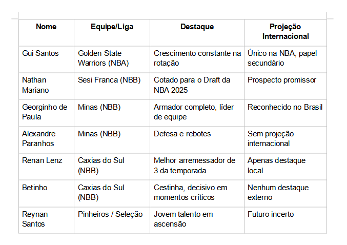 Apesar de o Brasil não contar com representantes de peso nas ligas europeias ou na WNBA, o NBB (Novo Basquete Brasil) continua sendo um celeiro de talentos. Em 2025, alguns nomes se destacam no cenário nacional, embora ainda não tenham projeção internacional.