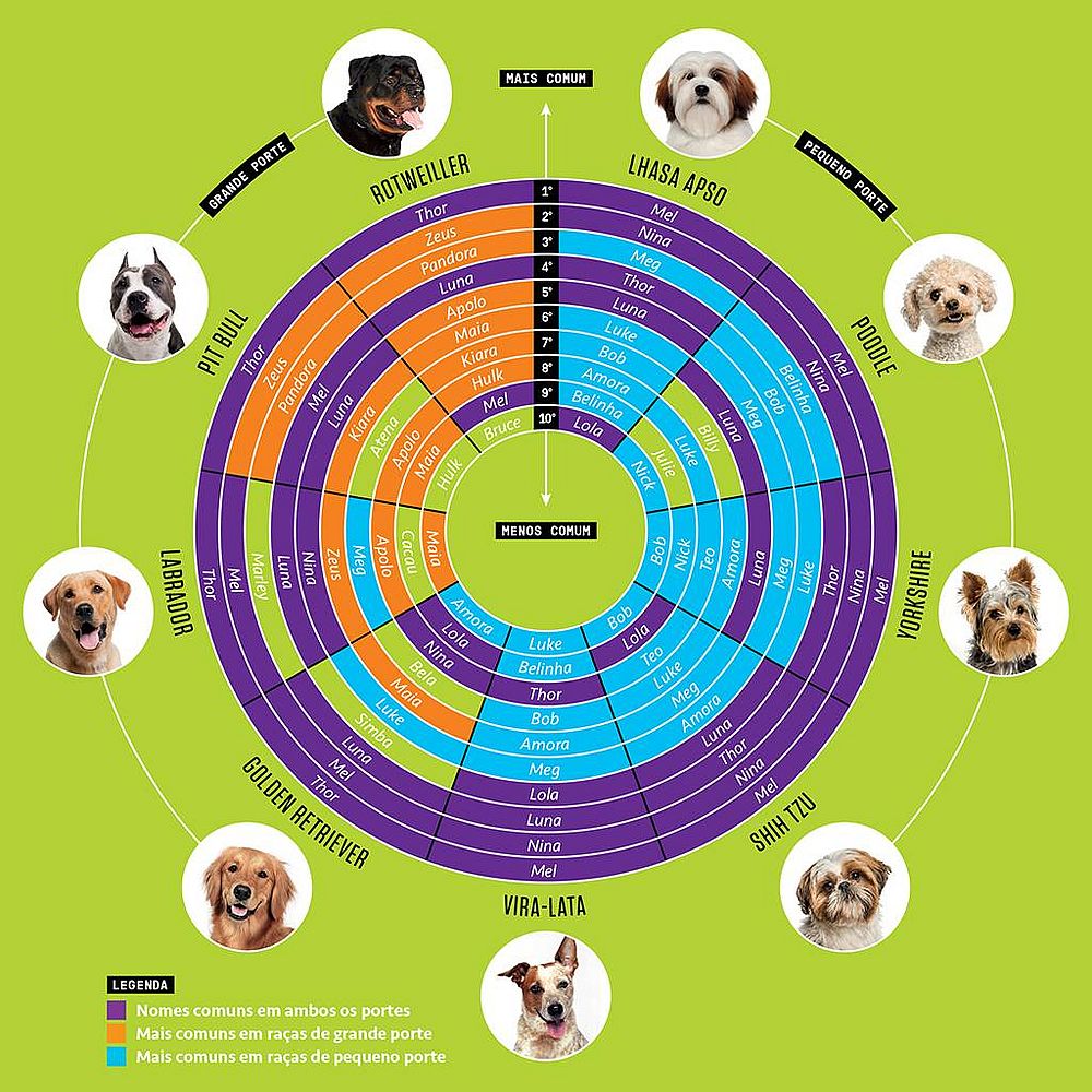 À pedido da Super, eles forneceram um recorte dos nomes mais comuns para nove das raças de cachorro mais populares do Brasil. O resultado você confere abaixo.Outros nomes se destacam mais dependendo da raça. Marley, por exemplo, só está presente na lista de labradores, fazendo referência ao filme que te deixou em prantos no cinema em 2008. Simba, por outro lado, figura apenas na lista de golden retrievers – talvez pela semelhança entre o pelo do cão e a juba do leão da Disney.O caso mais engraçado é talvez o de Belinha, que encontra-se em terceiro lugar entre na raça poodle. Provavelmente, uma grande influência da cachorrinha de Ana Maria Braga que dominou as manhãs da televisão entre 2001 e 2015.