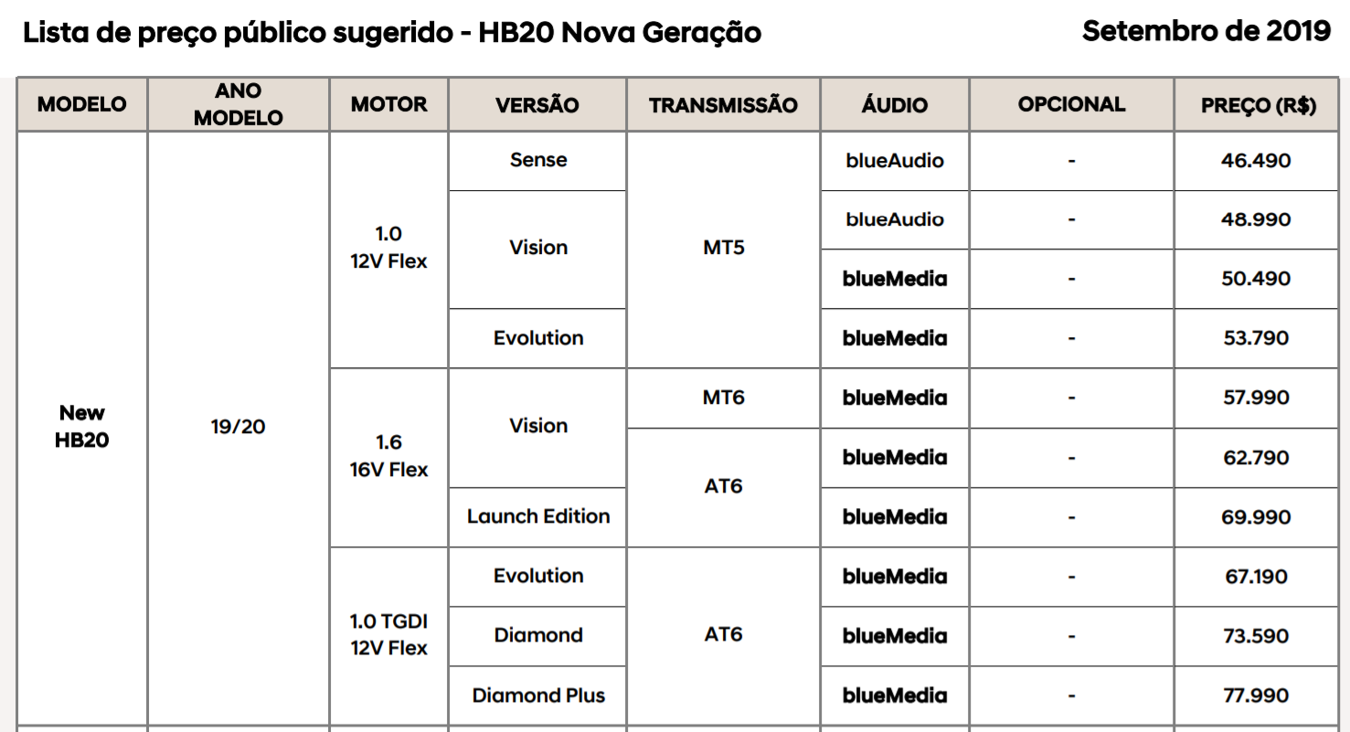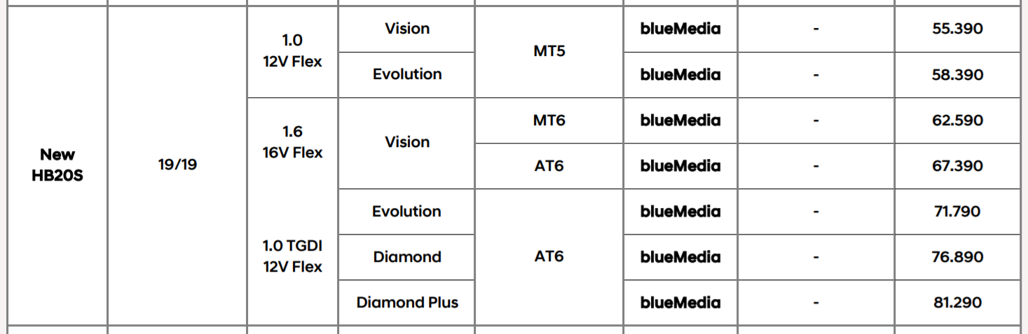 Já o HB20S sai de fábrica com opções Vision (1.0l MT, 1.6l MT e 1.6l AT), Evolution (1.0l MT e 1.0 Turbo GDI AT), Diamond (1.0l Turbo GDI AT) e Diamond Plus (1.0l Turbo GDI AT).
