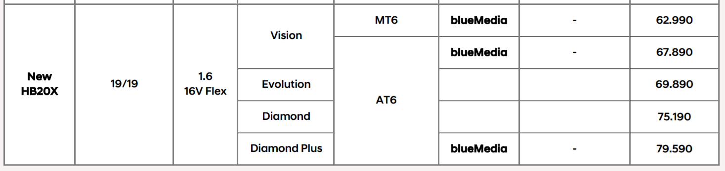 A família fica completa com o aventureiro HB20X, disponível nas versões Vision (1.6l MT e 1.6l AT), Evolution (1.6l AT), Diamond (1.6l AT) e Diamond Plus (1.6l AT).