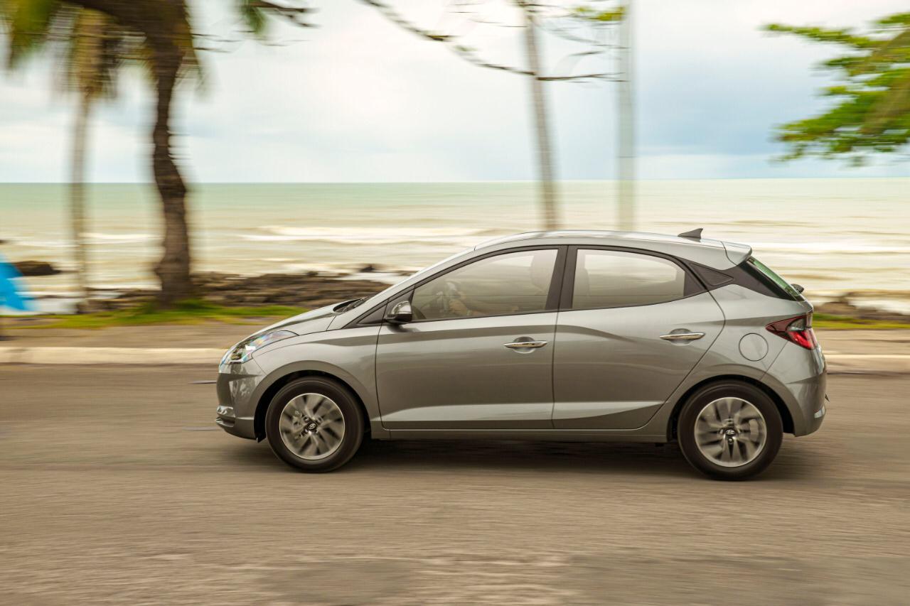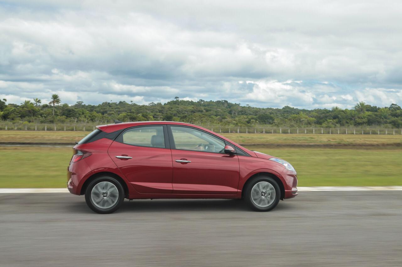 As linhas que cortam a silhueta lateral do HB20 partem dos faróis – elas aparecem entre as janelas e as maçanetas, e terminam no meio da porta traseira. Outro vinco surge nas bases das portas e complementa o visual. As novas rodas de liga leve e o conceito de teto flutuante estão disponível no HB20 e no HB20X.