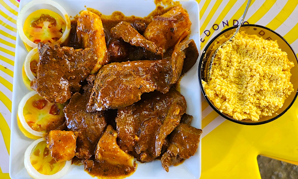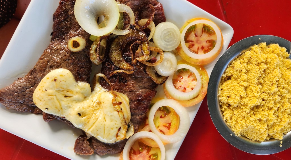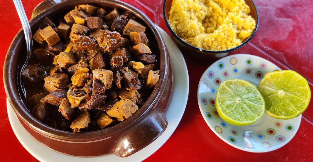 Quero sua resposta, mas sem maldade! E explico, P e G é o tamanho da comida do Almoço do Wagner (@almocodowagner) na Praça da Caixa D’água, no bairro Jacintinho (nosso Jaça) e, independente do tamanho, o tempero é danado de bom, fica até difícil de saber por onde começar, ainda mais quando a cerveja é gelada e boa. Então, que tal sarapatel de porco (porco, fígado, rim, sangue, tomate, cebola, cominho, alho e pimentão) com farofa das boas para misturar com caldo encorpado da tradição? Ah, não esqueça de colocar um pouco de pimenta e… está tudo perfeito!