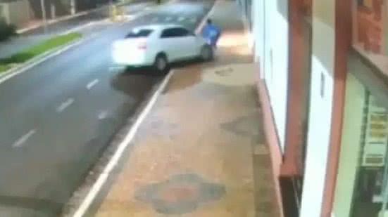 Nas imagens, é possível ver o momento em que o carro atinge o homem, que é arremessado, aparentemente, para dentro de um imóvel.