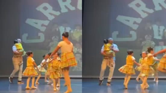 Mesmo sem nenhuma preparação, sem figurino, tampouco ensaio, o pai dançou com leveza, naturalidade e alegria com a pequena no colo. Ele acompanhou os passos das outras crianças e da professora. Mais do que acalmar a filha, o homem transformou a apresentação dela em um momento inesquecível.