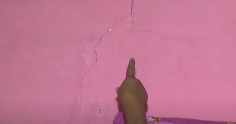 ![]() Dona Jeruza aponta para novas rachaduras que teriam surgido recentemente (Foto: Reprodução/TV Pajuçara) |