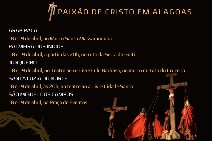 Em Alagoas, a Paixão de Cristo, tida como a maior história de todos os tempos, é encenada em vários lugares, tendo produções mais tradicionais no interior do estado, do Agreste ao Sertão.