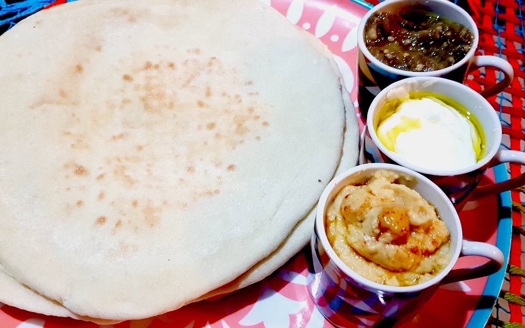 Pão árabe com as pastas tradicionais: homus (grão de bico), coalhada e babaganuche (berinjela)
