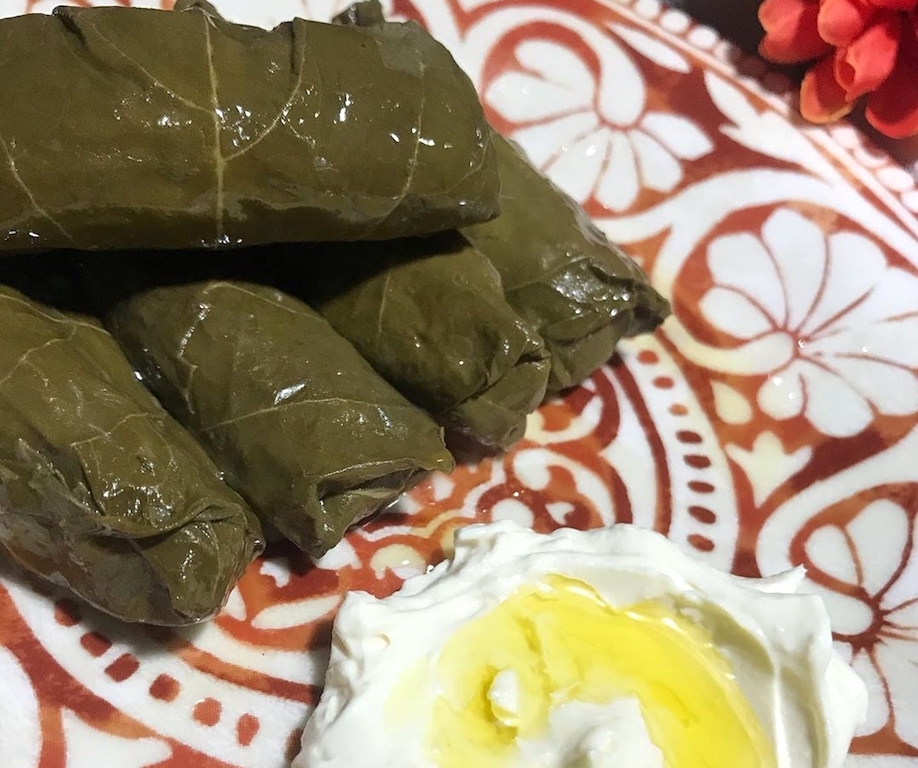 Charutinho de folha de uva recheado com carne e arroz, e ao lado coalhada com azeite