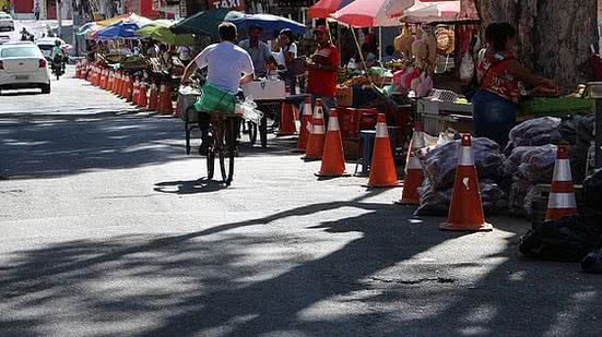 Inicialmente, para a demarcação da área destinada aos comerciantes informais, estão sendo utilizados cones, delimitando o espaço de cada ambulante e restringindo o estacionamento irregular de veículos na famosa Rua das Árvores.