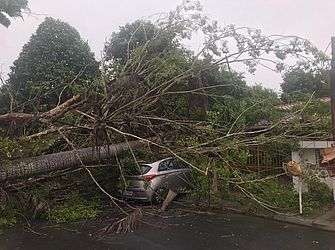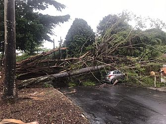 Na tarde de hoje, duas árvores do tipo Palmeira-imperial caíram e atingiram um veículo e uma residência, no Conjunto Jardim Petrópolis, parte alta da capital. Ninguém ficou ferido.