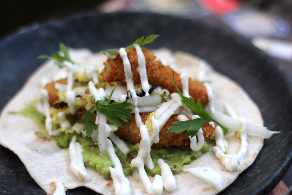 Divina Gula, do chef Vitor e André Generoso: taco de peixe empanado, guacamole, acelga ácida grelhada com sour-cream, e arroz de pato.
