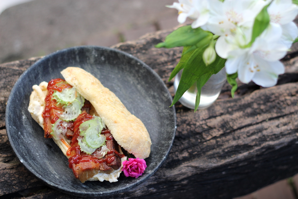 Homenagem ao Divina Gula: Pão de Queijo barriga de porco, picles de maxixe e molho de goiabada