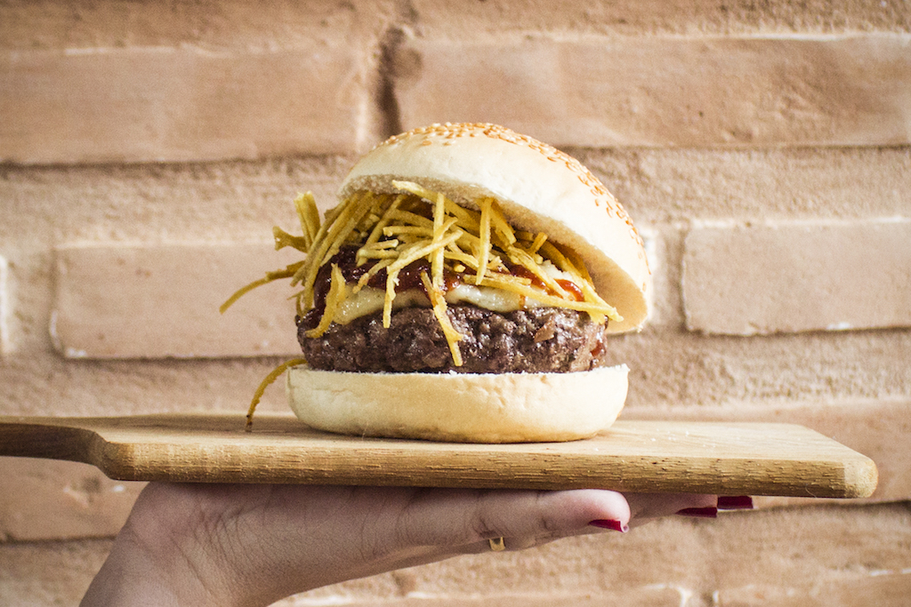Santo Burguer: Burger de picanha, queijo manteiga, barbecue de goiabada e crispy de banana da terra