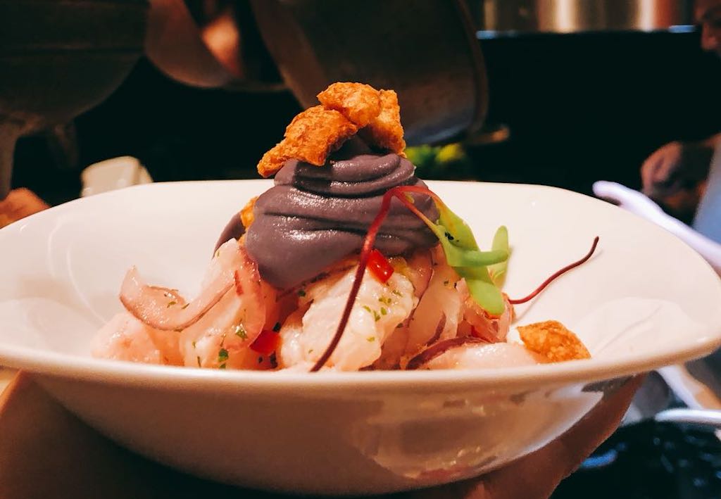 Piccola Villa: Marinada de peixe, com creme de batata doce e pipoca de porco.