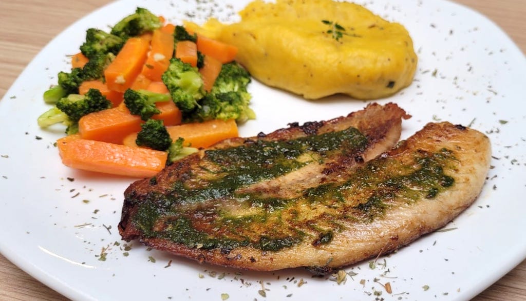 Filé de tilápia com purê de banana e legumes salteados