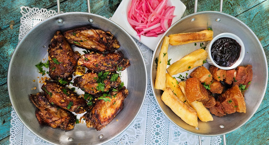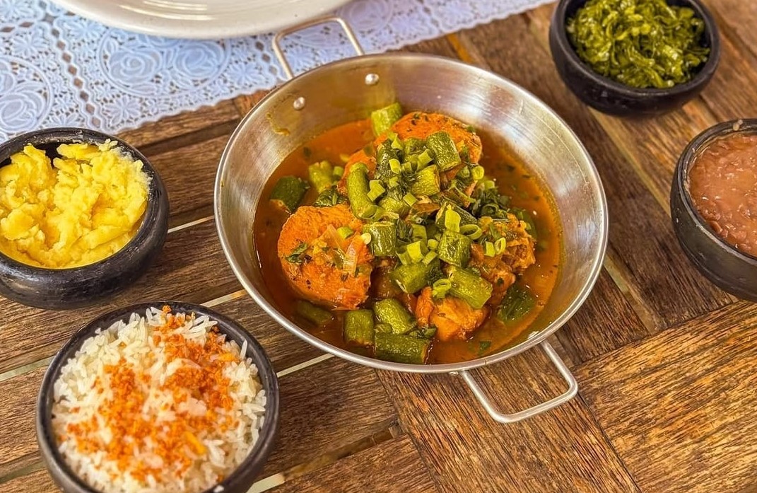Frango com quiabo, torresmo, costelinha suína, tutu à mineira... São algumas das “mineirices” do quintal doce de Sil, em Riacho Doce. O frango com quiabo segue a tradição: carne macia, quiabo no ponto certo, angu de fubá, couve, feijão preto e arroz — porção farta e saborosa, feita para dividir.