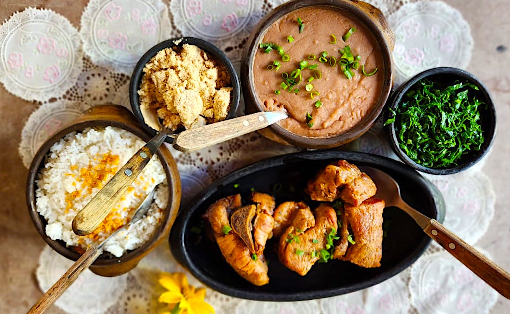 Outra pedida é a costelinha com ora-pro-nóbis, folha típica da cozinha mineira, rica em nutrientes e boas lembranças. A carne é cozida lentamente e servida com arroz de alho, angu e feijão tropeiro — simplicidade e sabor em perfeita harmonia.