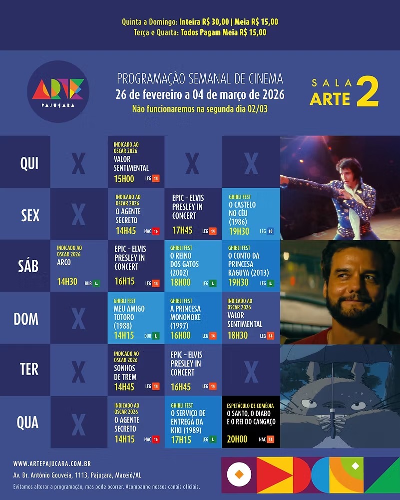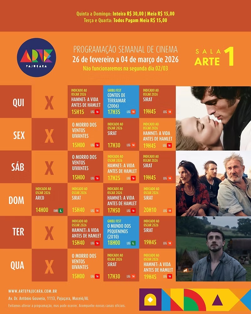 Para conferir a programação completa de todos os filmes em cartaz no Arapiraca Partage Shopping, Centerplex (Shopping Pátio Maceió), Cinesystem (Parque Shopping) e Kinoplex (Maceió Shopping): basta clicar aqui. Já para o Shopping da Vila, em Delmiro Gouveia, pode ser conferida aqui.