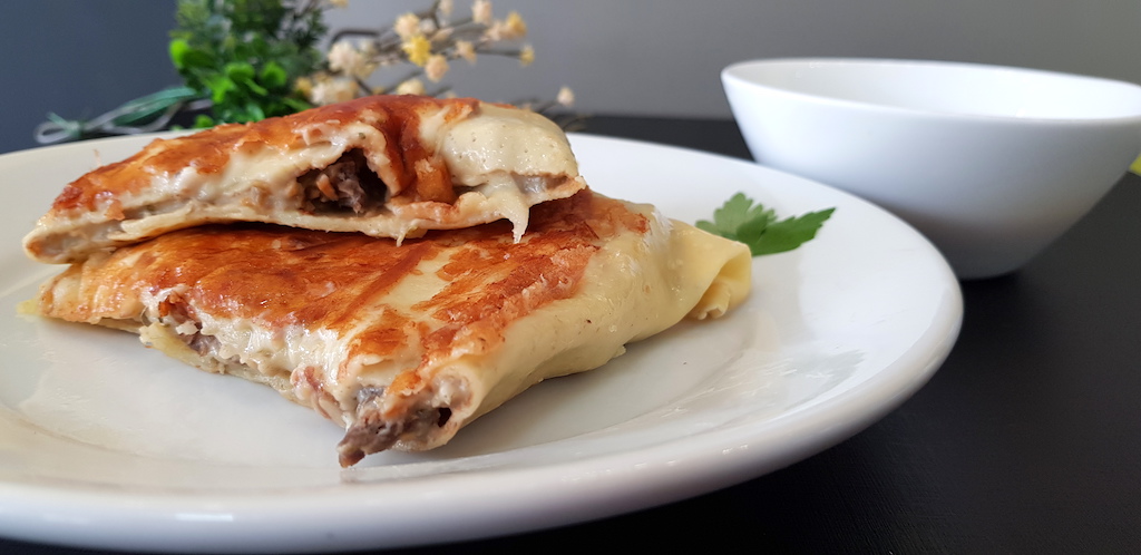 Panqueca de alcatra com crosta de queijo parmesão