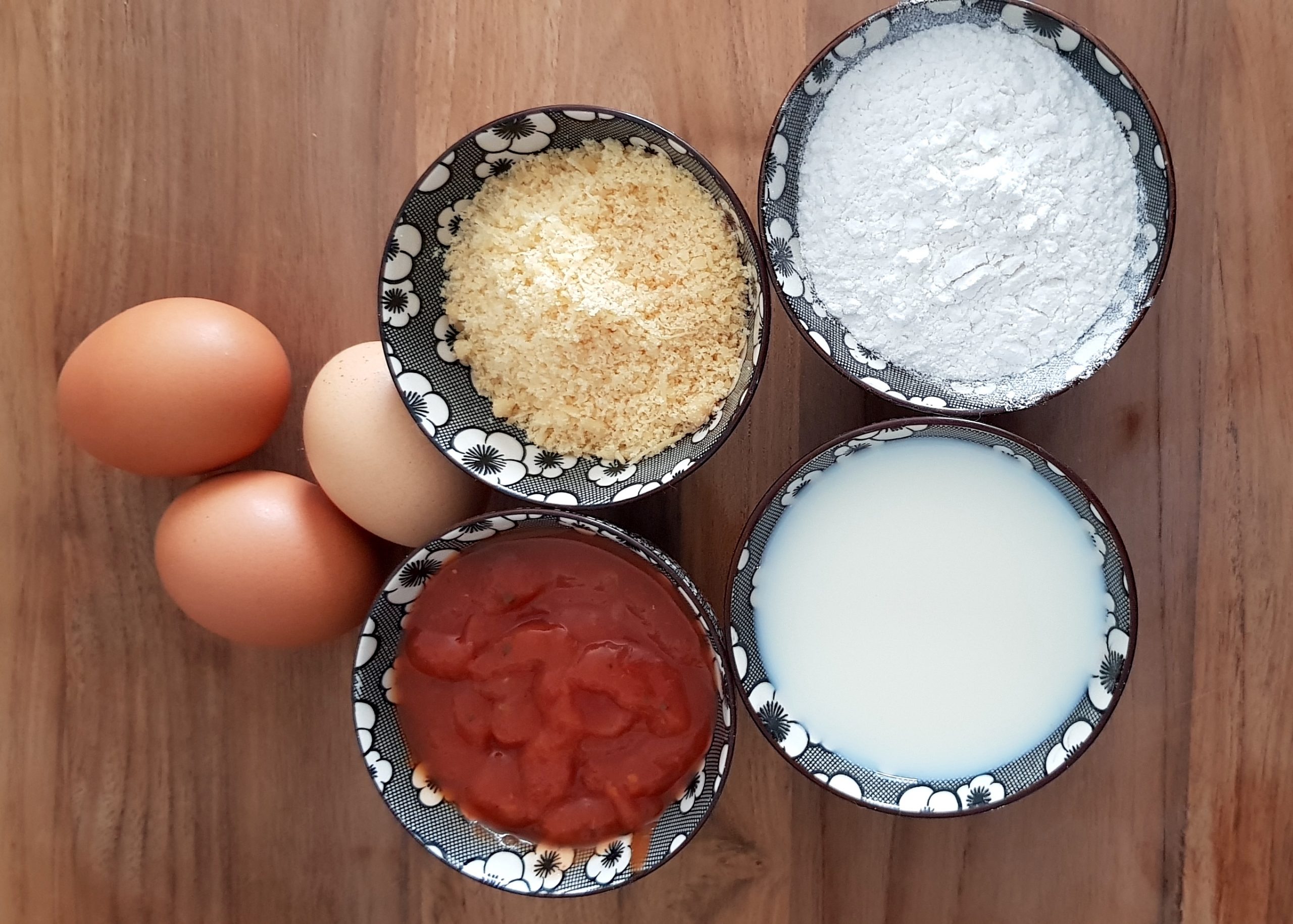 Pra fazer essa receita sem glúten, você vai precisar de: farinha de arroz (usei a da marca Urbano, fácil de achar), ovos, leite, molho de tomate e queijo parmesão.