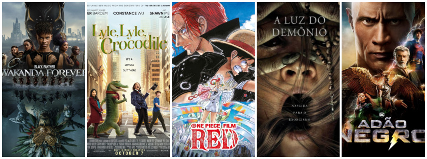 Na parte alta da cidade, ‘Pantera Negra: Wakanda Para Sempre’ chega com destaque com protagonismo feminino no centro da tela em trama de guerras entre reinos. ‘Lilo, Lilo, Crocodilo’, ‘One Piece Film: Red’, ‘A Luz do Demônio’ e ‘Adão Negro’ ainda continuam em exibição.