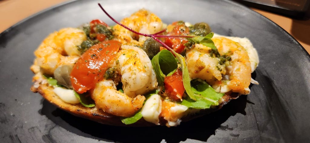 Toast camarão com requeijão cítrico, rúcula, camarão a provençal, tomate confit, pesto e alcaparras.