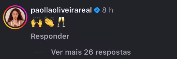 Ainda assim, o gesto foi o suficiente para gerar especulações e até torcida para a volta do "casal borogodó". "Voltem, Paolla!", pediu um seguidor. "Se estão bem separados, maravilha. Mas, se a situação tiver solução, voltem. Vocês são muito lindos juntos", comentou outra admiradora do casal.
