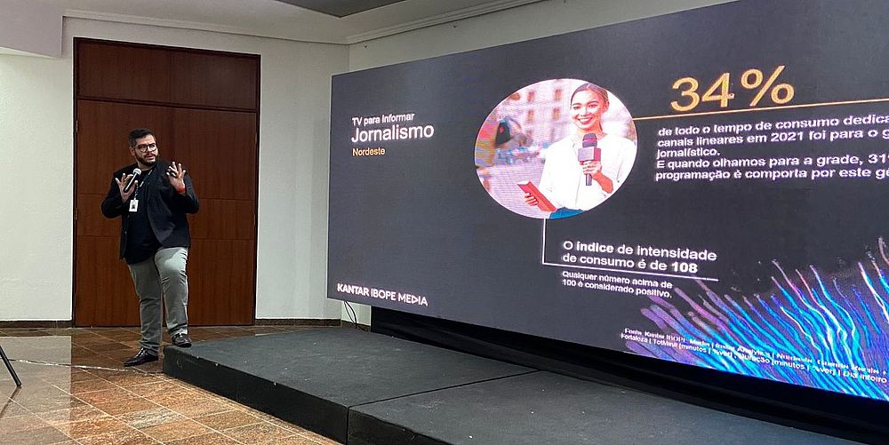 ALCANCE DA TV ABERTA - No evento, Rafael Abreu, que representou o Kantar Ibope, apresentou o panorama sobre a potência e alcance da TV aberta e plataformas de vídeo, trazendo para o público ouvinte um painel atual das demandas do telespectador e de quem produz televisão no mercado nordestino. Abreu ressaltou a relevância dos produtos em vídeo para as emissoras de TV do Nordeste.