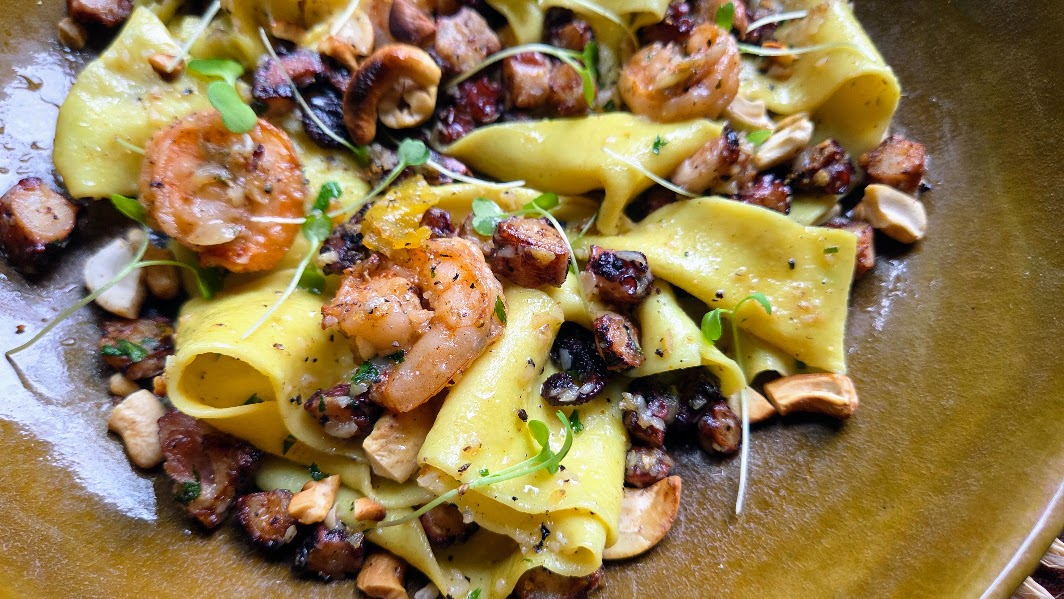 É mais do que um prato favorito — é paixão mesmo! O pappardelle pescador, com sua massa larga e caseira, chega envolvido num molho de manteiga com limão que equilibra acidez e cremosidade na medida certa. Por cima, camarões e polvo grelhados trazem o sabor do mar, intenso e cheio de personalidade. Quem assina essa beleza é a chef Denise Xavier, do Kareuóka. E não é à toa: Denise Xavier (@chefdenisexavier) tem um verdadeiro xodó pelas massas artesanais — e isso a gente sente em cada garfada. Anote o endereço: Av. Gustavo Paiva, 936 — em frente ao Parque Shopping e ao lado da Leroy Merlin