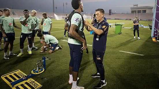 Um acessório usado pelos jogadores da seleção brasileira no treino desta segunda-feira (21) chamou atenção dos jornalistas e convidados que estiveram nas arquibancadas do estádio Grand Hamad, em Doha. Sob orientação dos preparadores físi...