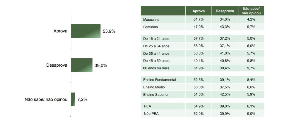 Ainda segundo o levantamento, 39% desaprovam a gestão do PSL. 7,2% não sabem ou não opinaram.