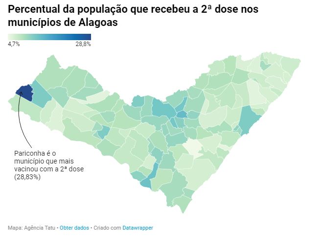 Pariconha, localizada no Sertão, é o município alagoano com maior percentual da população que já completou a imunização contra a Covid-19, ou seja, que já tomou as duas doses necessárias, segundo informações coletadas pela Agência Tatu na plataforma Localiza SUS, do Ministério da Saúde.