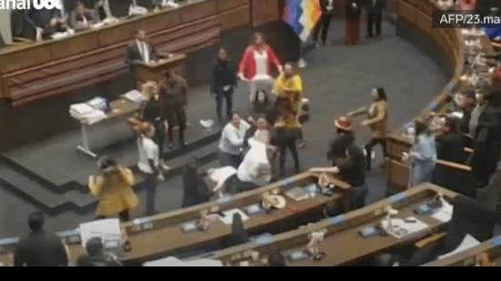 A leitura de um relatório em uma sessão no Parlamento boliviano ontem acabou em briga entre os parlamentares. Parlamentares governistas e opositores se agrediram por conta de cartazes contra o governo. Membros da oposição protestaram com mensagens de "com presos políticos não há democracia" e com uma foto do ministro de Governo, Eduardo Del Castillo, e a legenda "ministro do terror".