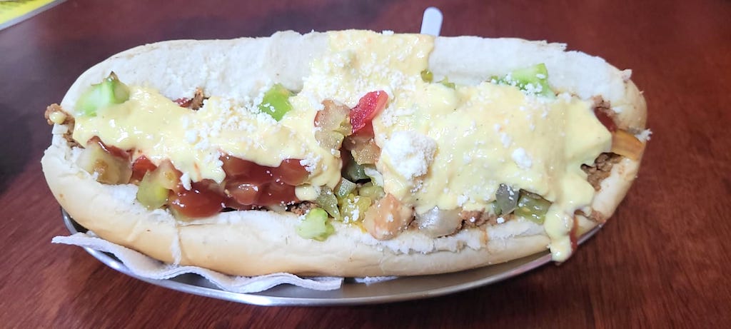 Vamos começar pelo todo poderoso, o passaporte batizado de Rock, que tem a idade da lanchonete e é um dos queridinhos, pão seda, carne moída, salsicha e verduras. Lá, é conhecido como passaporte pequeno, porque o Gigante é para quem é mesmo bom de boca, tem 150 gramas de pão seda, duas salsichas, carne, maionese de cenoura e verdura. Verdadeiro escândalo de bom.