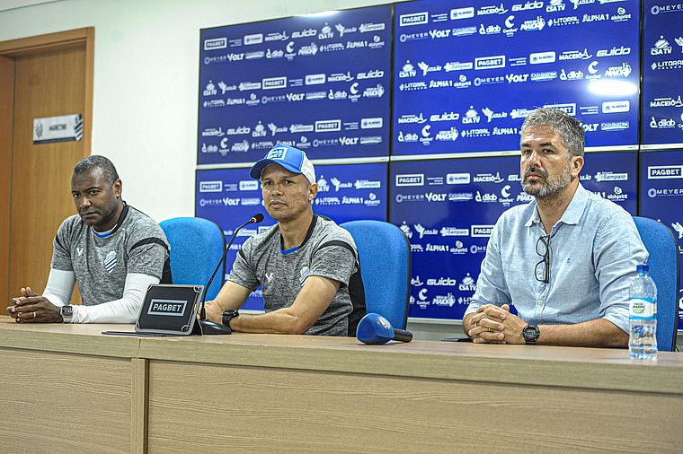 ![]() O auxiliar Zé Carlos, o técnico Higo Magalhães e o executivo Rodrigo Pastana (Foto: Augusto Oliveira / CSA) |