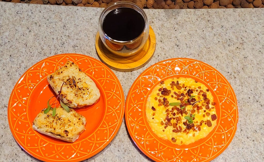 Café da manhã: ovos cremoso com bacon com pão na nata