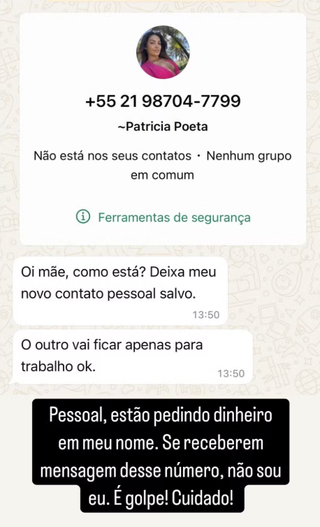 Na imagem publicada pela apresentadora do Encontro, é possível ver que o criminoso utilizou indevidamente uma foto de Patrícia Poeta como imagem de perfil. O golpe consistia em avisar contatos próximos de que aquele seria o novo número pessoal da jornalista, numa tentativa de ganhar confiança e aplicar fraudes.
