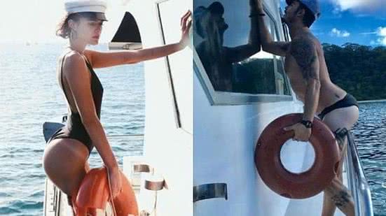 É que o ator, que está no ar em O Sétimo Guardião, compartilhou uma imagem em seu perfil oficial no Instagram em que aparece imitando uma das fotos de Bruna em Fernando de Noronha.