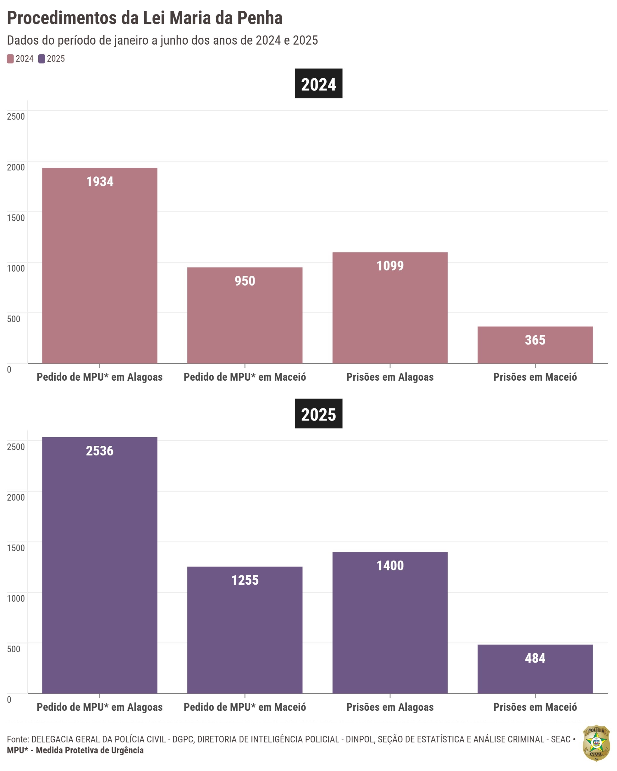 Os dados, oriundos do setor de estatística e análise criminal da Secretaria de Segurança Pública de Alagoas (SSP/AL), mostram um fator importante: os pedidos de Medida Protetiva de Urgência (MPU) cresceram mais de 31% em Alagoas e 32% em Maceió, comparando com o mesmo período de 2024.