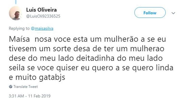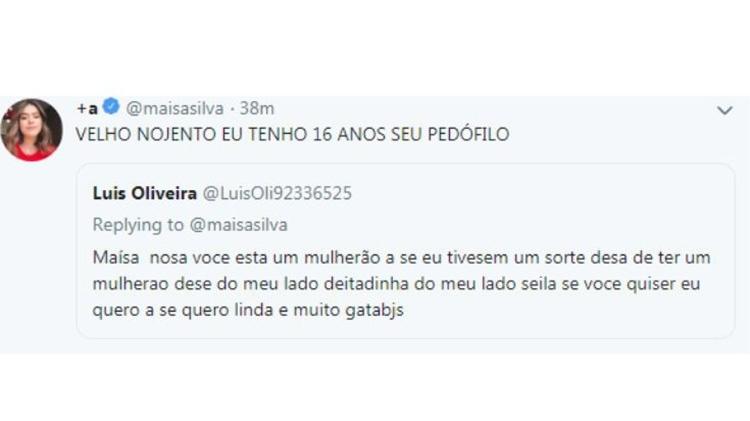 Vítima recorrente de assédio pelas redes sociais, Maisa Silva não deixou passar um tweet de um seguidor nesta segunda (11). O usuário identificado como Luís Oliveira respondeu a uma foto da atriz com a seguinte mensagem: