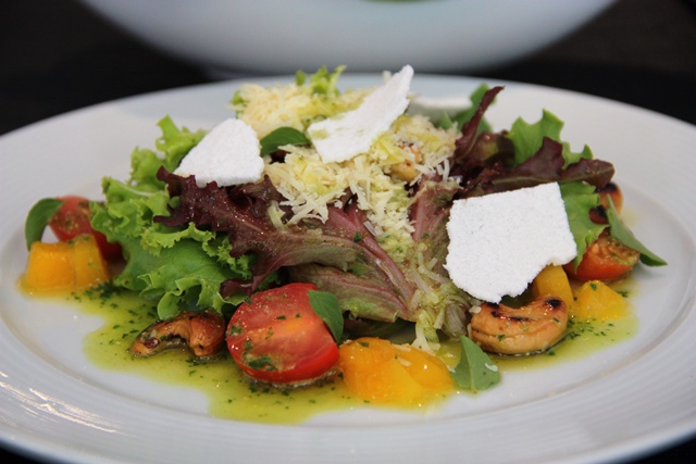Pra começar – Salada Sur ou arrumadinho de pato são as duas opções de entrada. A salada leve ganha sabor com a castanha, manga cubos de doce de manga, molho pesto e tomates cerejas e o queijo primadonna