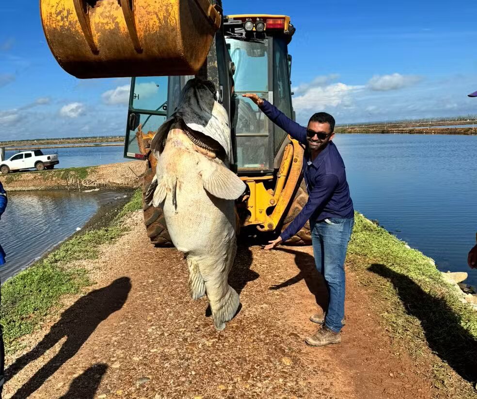Um peixe de aproximadamente 200 kg foi encontrado já morto em um canal de abastecimento de uma fazenda de produção de camarão localizada em Pendências, região Oeste potiguar, na manhã desta terça-feira (5).