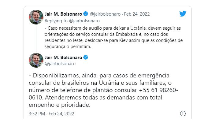 Em suas redes sociais, o presidente disse que "estar totalmente empenhado" em auxiliar os brasileiros e que, caso precisem, "caso necessitem de auxílio para deixar a Ucrânia, devem seguir as orientações do serviço consular da Embaixada".