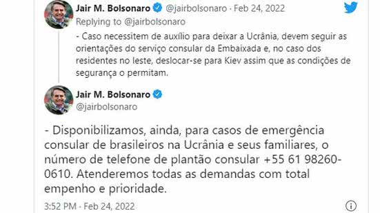 Em suas redes sociais, o presidente disse que "estar totalmente empenhado" em auxiliar os brasileiros e que, caso precisem, "caso necessitem de auxílio para deixar a Ucrânia, devem seguir as orientações do serviço consular da Embaixada".