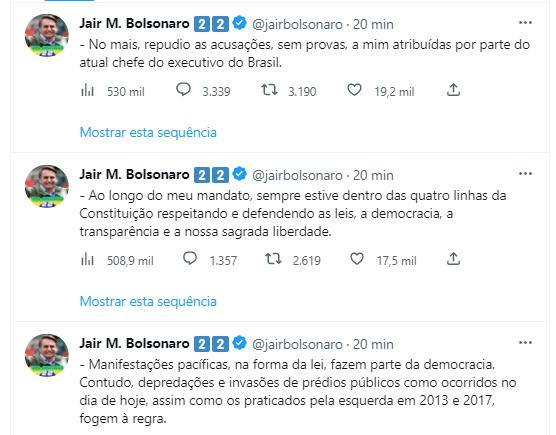 Em uma sequência de três mensagens, Bolsonaro, que atualmente está nos Estados Unidos, critica as depredações e invasões a prédios públicos, aproveitando para alfinetar o atual presidente ao relembrar de manifestações de grupos de esquerda em 2013 e 2017. Ele ainda repudiou o que ele chama de "acusações sem provas" feitas pelo presidente Luís Inácio Lula da Silva (PT).