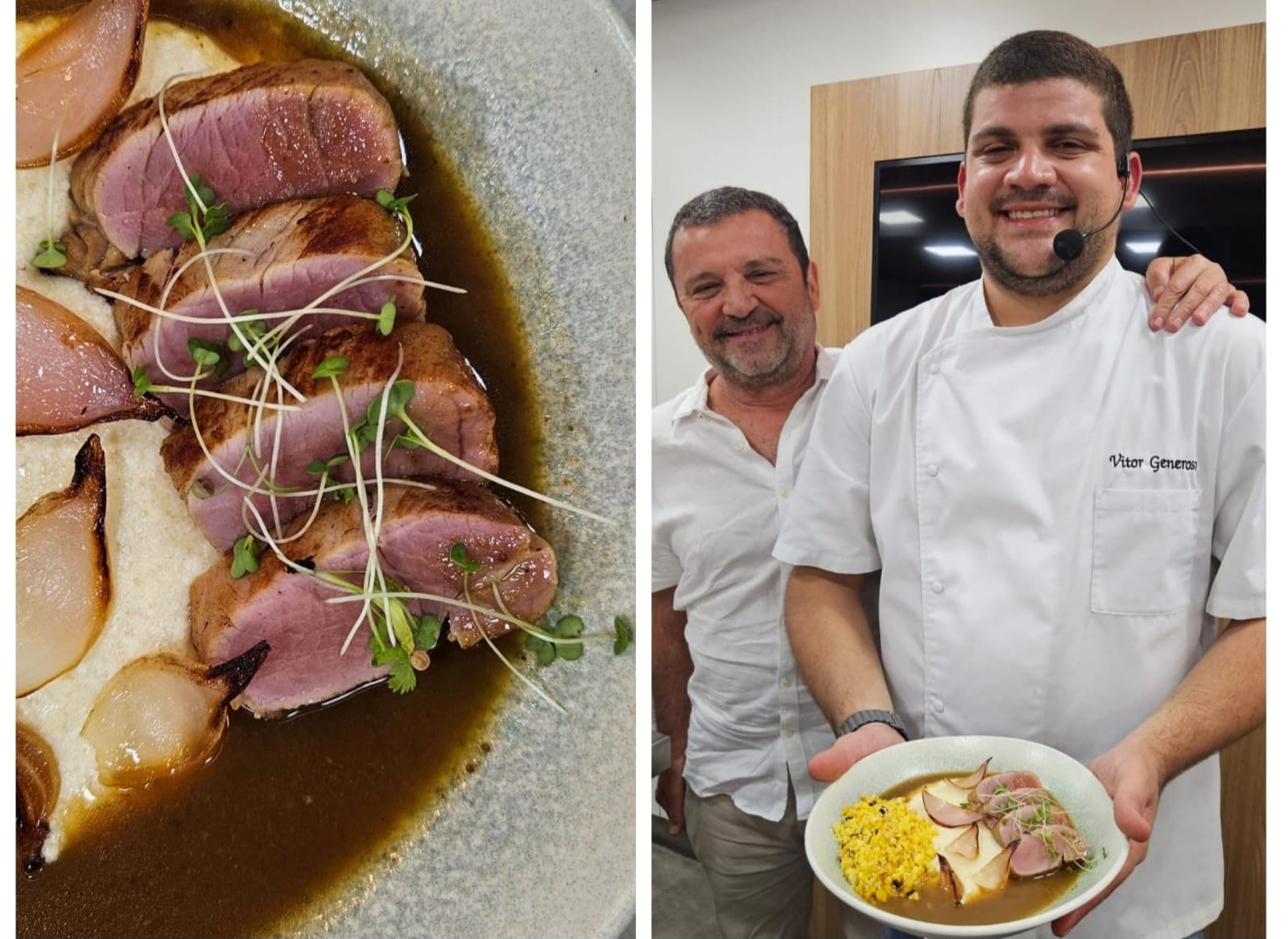 O chef Vitor com o pai e chef André Generoso e a receita de carne sol suina