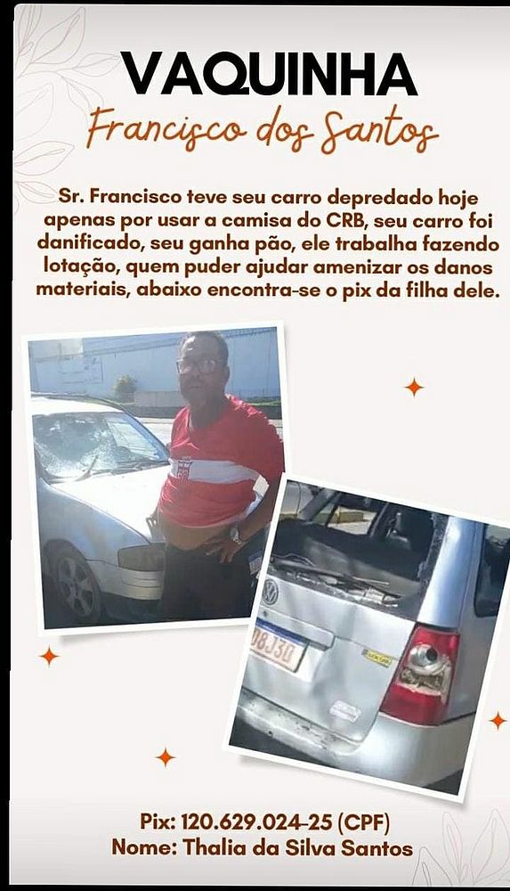 Aos 59 anos, o morador de Sauaçuí, no Litoral Norte de Maceió, disse que encarava mais um dia de trabalho, com clientes que iam para o Estádio Rei Pelé, para acompanhar o jogo entre CRB e Sergipe, pela Copa do Nordeste, mas teve a viagem interrompida depois de a avenida ter sido "invadida" pelos criminosos armados com paus, pedras e bombas. Assim como os passageiros, Seu Francisco também tem o futebol e o CRB como paixão, e por vestir a camisa do clube, foi hostilizado e agredido.