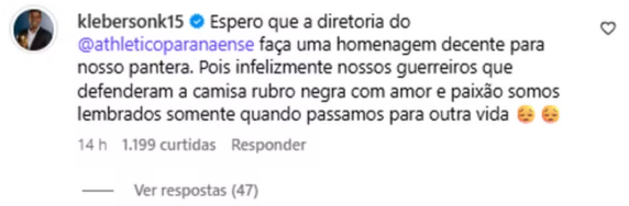 Espero que a diretoria do @athleticoparanaense faça uma homenagem decente para nosso pantera. Pois infelizmente nossos guerreiros que defenderam a camisa rubro negra com amor e paixão somos lembrados somente quando passamos para outra vida 😔😔